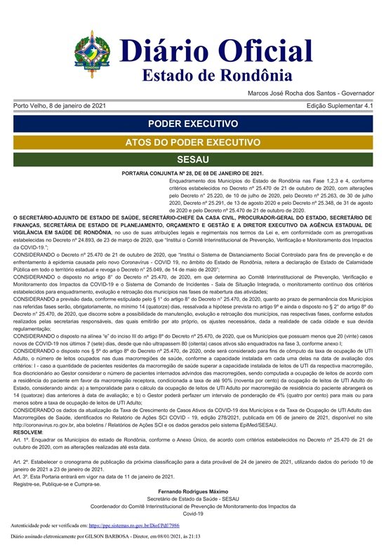 Uma Portaria Conjunta publicada pelo Governo de Rondônia na noite da última sexta-feira (8), reclassificou sete cidades para a primeira fase do plano de distanciamento social. A decisão se deve ao aumento de casos de coronavírus nessas regiões.