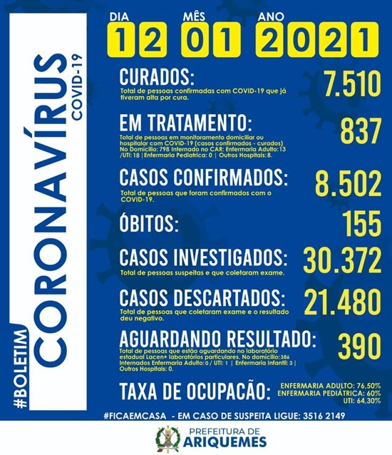 Nesta terça-feira (12), foram registradas 50 altas médicas, com relação ao boletim do dia anterior, chegando a 7.510 pessoas curadas, o que equivale a 88,33% do total dos casos.