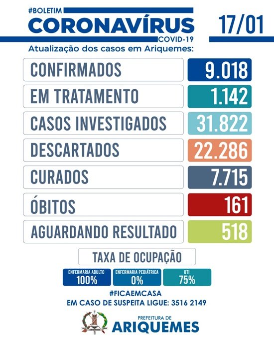 Houve dois óbitos neste domingo, sendo um homem de 61 anos e uma mulher de 71 anos. Ambos possuíam histórico de comorbidade e estavam internados no CAR. Assim, Ariquemes acumula 161 óbitos em decorrência da Covid-19.