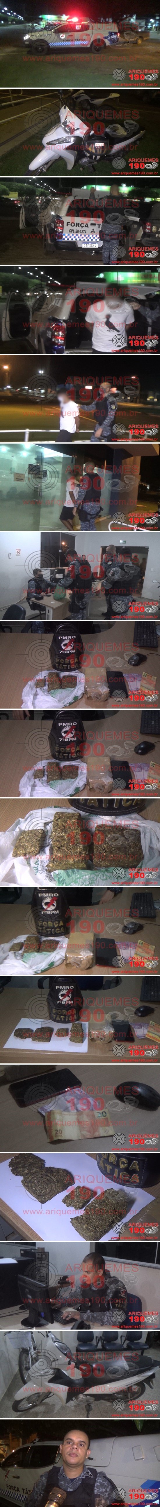 Em uma belíssima ação das guarnições da Polícia Militar, denominadas Força Tática 01, composta pelos policiais: 3º Sgt. Cleilton, CB Ideam e SD Marcos Santos, juntamente com a Força Tática 02, composta pelos policiais: CB Ribeiro, CB Simão e SD Ribas, resultou na apreensão de drogas e na prisão de dois jovens na noite desta sexta-feira, 22/01, no Bairro Vila do Sossego em Ariquemes/RO. A ação iniciou por volta das 21h53m, quando as guarnições realizavam patrulhamento de rotina no Bairro Vila do Sossego, momento em que avistaram um indivíduo trafegando em uma motoneta Honda/Biz de cor branca, e que aparentava estar nervoso, como se procurasse por alguém, nos cantos escuros da rua. Diante da suspeita, os policiais deram ordem de parada, realizaram abordagem e revista pessoal ao indivíduo, de 21 anos de idade. Ao realizaram revista veicular à motoneta, foi encontrada no bagageiro meio tablete de substância entorpecente, que aparentava ser Maconha, uma pedra amarela, enrolada em uma embalagem de plástico filme. Ao indagar o indivíduo, sobre a posse da droga, este relatou que o entorpecente era seu e a pedra amarela da sua esposa, e que também havia acabado de adquirir a droga. O indivíduo relatou aos policiais que em sua residência teria mais drogas, sendo que de posse dessa informação, as guarnições se deslocaram até o local, onde ao chegarem, se depararam com a esposa do infrator, de 19 anos de idade, que ficou muito nervosa com a presença da Polícia, momento em que correu e adentrou ao quarto do casal, e ficou próxima a janela. Os PMs realizaram buscas pela residência, onde foi localizada dentro do guarda roupas, uma sacola contendo um pouco de sustância entorpecente, que aparentava ser Maconha. Os policiais indagaram a jovem sobre a droga e o porquê teria ido ao quarto, porém esta não deu maiores informações aos PMs. Durante buscas pelo quintal da casa, foi encontrada em baixo da janela, uma porção de sustância entorpecente tipo Maconha, que provavelmente foi arremessada pela janela no momento em que a jovem adentrou no quarto. A jovem informou aos PMs, que a pedra de cor amarela enrolado no papel filme, era cera de depilação. Mediante aos fatos, constatações e confissão, foi dada voz de prisão aos jovens, sendo estes conduzidos, juntamente com a motoneta, dois aparelhos celulares, uma quantia de R$ 30,00 (trinta Reais), a pedra amarela e a droga, que totalizou 601 gramas, à Unidade de Segurança Pública (UNISP), onde o Boletim de Ocorrência Policial (BOP) foi registrado, para tomadas de providências que a autoridade policial plantonista julgar pertinente.