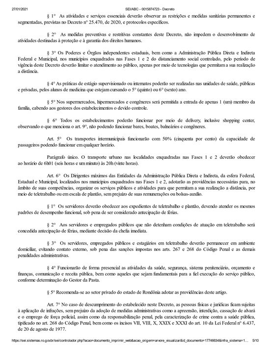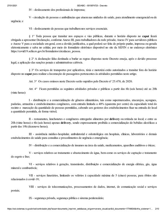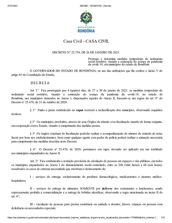 O Governo de Rondônia, por meio do Decreto n° 25.754 de 2021, prorroga por mais quatro dias, até sábado (30), as medidas temporárias do Isolamento Social Restritivo para os municípios que se encontram nas Fases 1 e 2 do Plano Todos por Rondônia. As medidas do novo decreto são semelhantes ao anterior, tais como a manutenção do toque de recolher entre 20h e 6h, com ressalvas; proibição da venda de bebidas alcoólicas entre 19h e 6h, bem como o consumo em qualquer horário, entre outros. O ato normativo também apresenta novas determinações a serem aplicadas, com vigor a partir desta quarta-feira (27). Confira o Decreto: