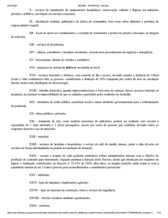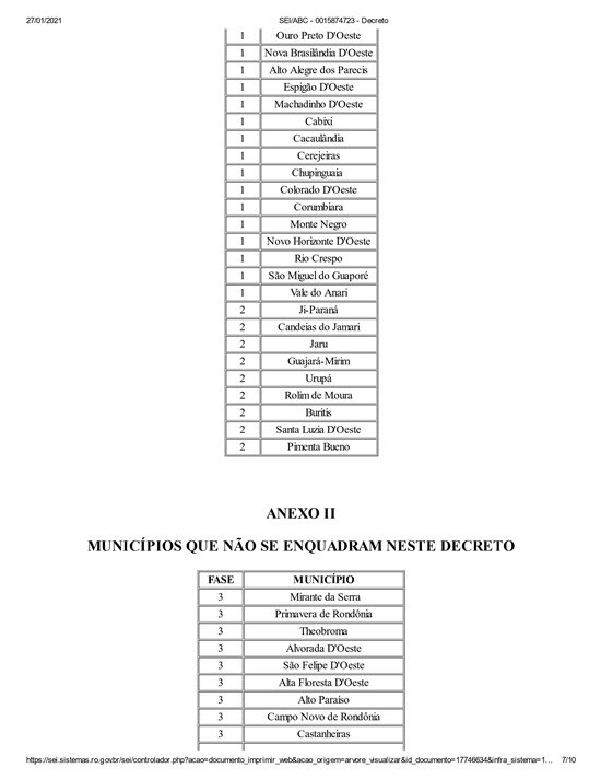 Observação: Informações extraoficiais dão conta que Ariquemes deve permanecer na fase 3 com mais restrições. O comercio terá redução do fluxo de clientes no interior do estabelecimento e há possibilidade de ser estabelecido toque de recolher após às 20 horas. Essa medida também será por 10 dias.