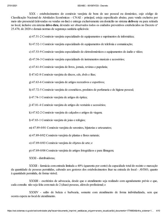 XXIX - os estabelecimentos do comércio varejista de bens de uso pessoal ou doméstico, cujo código de Classificação Nacional de Atividades Econômicas - CNAE - principal, esteja especificado abaixo, para venda exclusiva por meio não presencial (televendas ou vendas on-line) e entrega exclusivamente em domicílio no sistema delivery ou para retirada no local, inclusive em sistema drive-thru, devendo ser observados todos os cuidados preventivos estabelecidos no Decreto n° 25.470, de 2020 e demais normas de segurança sanitária aplicáveis: