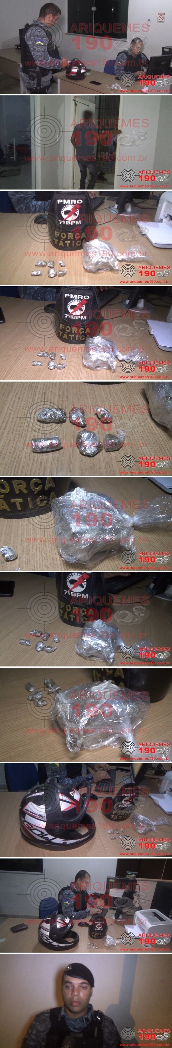Na noite desta sexta-feira, 29/01, as guarnições da Polícia Militar denominadas Força Tática 01, composta pelos policiais: 3º Sgt. Cleiton, CB Ideam e SD Marcos Santos, juntamente com a Força Tática 02, composta pelos policiais: CB Ribeiro, CB Simão e SD Ribas, lograram êxito em prender um indivíduo e apreender droga na BR-421, próximo a Ponte do Rio Jamari, no perímetro que compreende a cidade de Ariquemes/RO. Eram por volta das 22h04m, quando as guarnições realizavam abordagem em veículos nas proximidades da Ponte, momento em que os policiais avistaram um indivíduo, que trafegava como passageiro de um moto táxi. O indivíduo aparentava estar nervoso ao perceber a presença das viaturas da Polícia, o que levantou suspeitas dos PMs. Diante da suspeitas, os policiais se deslocaram até a direção do indivíduo, momento em que os PMs visualizaram que o suspeito estava em posse de um objeto no interior de uma sacola , sendo que ao ver que seria abordado, o mesmo arremessou em direção da margem da rodovia. Os policiais abordaram o suspeito, e localizaram uma sacola plástica contendo em seu interior um pedaço de tablete de substância entorpecente tipo Maconha e seis parangas de Maconha, que totalizou 217 gramas. Ao indagar o condutor, este relatou aos policiais que havia iniciado a corrida no Setor 11 e que não conhecia o infrator. Mediante aos fatos e constatações, o infrator foi conduzido, juntamente com a droga, à Unidade de Segurança Pública (UNISP), onde o Boletim de Ocorrência Policial (BOP) foi registrado, para tomadas de providências cabíveis.