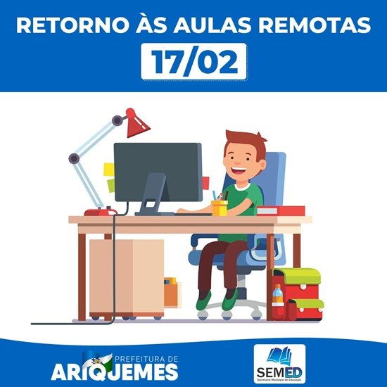 As aulas terão início dia 17/02, de forma remota, sem previsão de retorno presencial. Os professores e demais servidores poderão realizar suas atividades em home office, ou por escala no local de trabalho, que deverá seguir todo o protocolo de segurança.