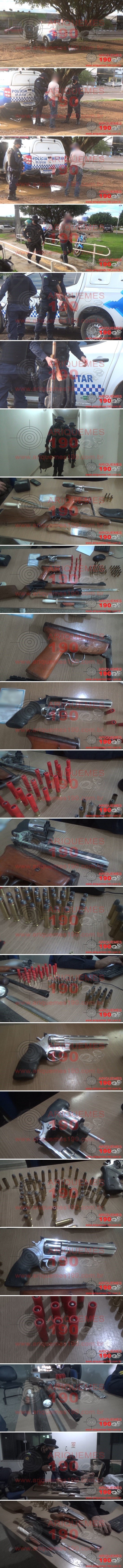 No entardecer deste sábado, 06/02, por volta das 18 horas, uma guarnição da Polícia Militar de Cacaulândia/RO, realizava patrulhamento de rotina pelas imediações da cidade, quando foi informada por populares, que um condutor que apresentava estar embriagado, trafegava no veículo Fiat/Uno de cor cinza e realizava zigue e zague na RO-140, próximo à entrada da cidade, e que este havia adentrado o município. Os policiais realizaram diligências pelas redondezas e localizaram um automóvel ligado e com a porta do motorista aberta, com as mesmas características repassadas pelos populares, e também avistaram um suspeito, que estava na varanda de uma residência. Ao entrarem em contato com a esposa do indivíduo, esta relatou aos policiais que o referido veículo, pertence ao seu esposo. Ao realizarem buscas ao automóvel foram encontrados sobre o painel, dois estojos deflagrados de munição, e na porta do veículo foi avistado em seu interior, uma arma de fogo tipo espingarda calibre .36 de tambor 5 tiros sem munições na câmara e um revólver calibre .357 com 8 munições intactas no tambor. Também foi encontrada uma mochila de cor preta, que continha em seu interior 26 munições de calibre .357, 18 munições de calibre .38, 17 munições de calibre .36, uma faca, um facão, uma lanterna e outra arma de fogo de fabricação caseira contendo uma munição de calibre .22 na câmara. Segundo narra o Boletim de Ocorrência Policial (BOP), foi realizado revista pessoal ao indivíduo, onde o mesmo aparentava forte odor etílico, apresentava falta de equilíbrio, falava arrastado e entre outros sinais de embriaguez. Durante abordagem, o indivíduo disse que não seria preso e também não seria revistado, onde foi necessário algemá-lo, para manter a integridade física do mesmo. Mediante aos fatos e constatações, foi dada voz de prisão ao indivíduo, o qual foi conduzido, juntamente com a pasta e armamentos, à Unidade de Segurança Pública (UNISP) de Ariquemes/RO. Durante a chegada à UNISP, os PMs foram informados, que o suspeito testou positivo para a COVID-19, sendo que o mesmo deveria estar em isolamento domiciliar, conforme orientado pela Secretaria de Saúde de Cacaulândia. O Boletim de Ocorrência Policial (BOP) foi registrado, para tomadas de providências que a autoridade policial plantonista julgar pertinente.