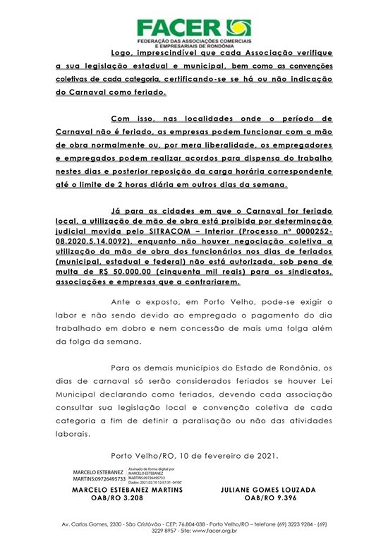 Segue abaixo parecer jurídico, em forma de nota explicativa, da Federação das Associações Comerciais e Empresariais de Rondônia (FACER), sobre o uso de mão-de-obra de trabalhadores durante o carnaval :
