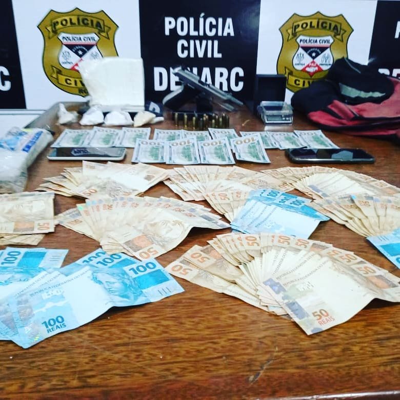 Na residência de F.F.L., os policiais encontraram uma pistola ponto 40, 9 mil reais, 1.300 dólares, munições e quase 1kg de cocaína, com grande teor de pureza.