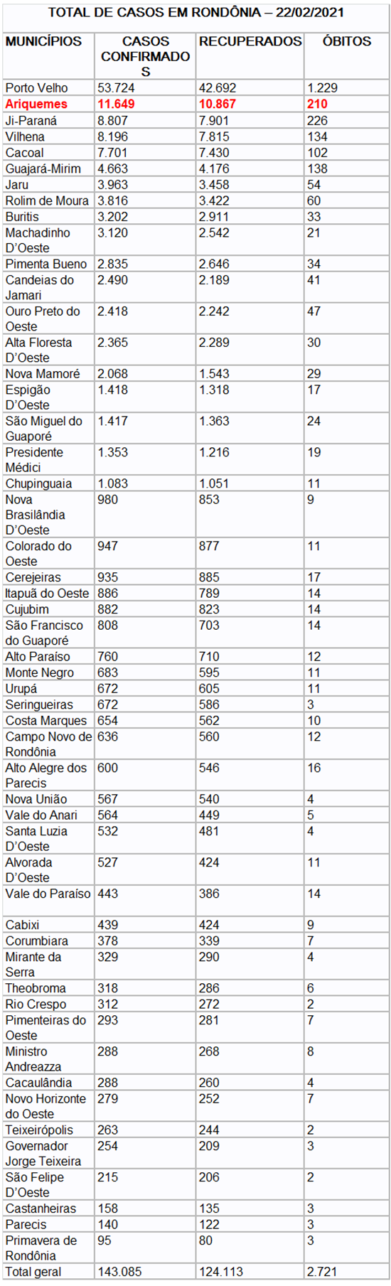 Nesta segunda-feira (22) foram consolidados os seguintes resultados para Covid-19 em Rondônia: