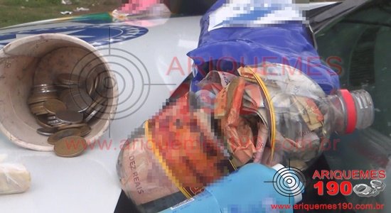Na tarde desta terça-feira, 23/02, por volta das 16h15m, uma guarnição da Polícia Militar realizava patrulhamento ostensivo pela Rua Canindé do Bairro Institucional em Ariquemes/RO, quando adentrou o espaço conhecido como “galinheiro”. Ao se aproximarem dos fundos de uma edificação, avistaram um indivíduo agachado, próximo a uma moita de capim, sendo que ao avistar a presença da viatura, tentou empreender fuga correndo, porém foi capturado. Os policiais abordaram e realizaram revista pessoal ao indivíduo, onde foi localizada nos bolsos da calça, uma moeda de R$ 01,00 (um Real), e ao percorrerem o trajeto realizado pelo indivíduo, foi encontrada ao solo R$0,70 (setenta Centavos). Ao se aproximarem da moita de capim, o indivíduo apresentava nervosismo, onde foi localizado dentro da moita, um frasco plástico de cor transparente contendo R$ 313,00 (trezentos e treze Reais), valor dividido em cinco cédulas de R$ 20,00 (vinte Reais), oito cédulas de R$10,00 (dez Reais), onze cédulas de R$ 05,00 (cinco Reais) e trinta e nove cédulas de R$ 02,00 (dois Reais), um cigarro de substância entorpecente tipo Maconha, e dentro de um pequeno frasco, uma pedra de droga análoga a Crack. Ao ser indagado pelos PMs, o suspeito relatou que desconhecia a presença de tais objetos e que estava agachado apenas pegando sua moeda que havia caído. Durante o diálogo, foi visualizado que o suspeito após a localização do dinheiro e a droga, olhava em direção a moita de capim, onde havia sido localizado os objetos. Os PMs averiguaram as moitas, próximas a primeira que havia sido averiguada, e que durante a varredura, foram localizados um frasco plástico na cor azul, contendo várias cédulas de dinheiro que totalizaram R$ 443,00 (quatrocentos e quarenta e três Reais) em espécie, um capacete de cor preta e um frasco plástico com várias moedas que totalizaram R$47,15 (quarenta e sete Reais e quinze Centavos). Através da Central de Operações da Polícia Militar, foi solicitado apoio da Equipe do Canil do 7º BPM, que compareceram ao local, e que durante verificação foi localizado próximo a um poste de iluminação pela K9 Belinha, um invólucro contendo uma substância entorpecente tipo Crack. Mediante aos fatos e constatações, o suspeito foi conduzido à Unidade de Segurança Pública (UNISP), onde o Boletim de Ocorrência Policial (BOP) foi registrado, para tomadas de providências posteriores.