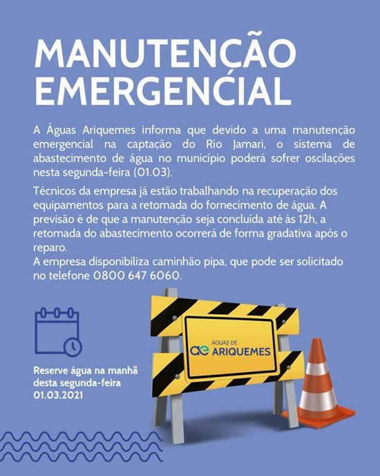 A Águas Ariquemes informa que, devido a uma manutenção emergencial na captação do Rio Jamari, o sistema de abastecimento de água no município poderá sofrer oscilações nesta segunda-feira (01.03).