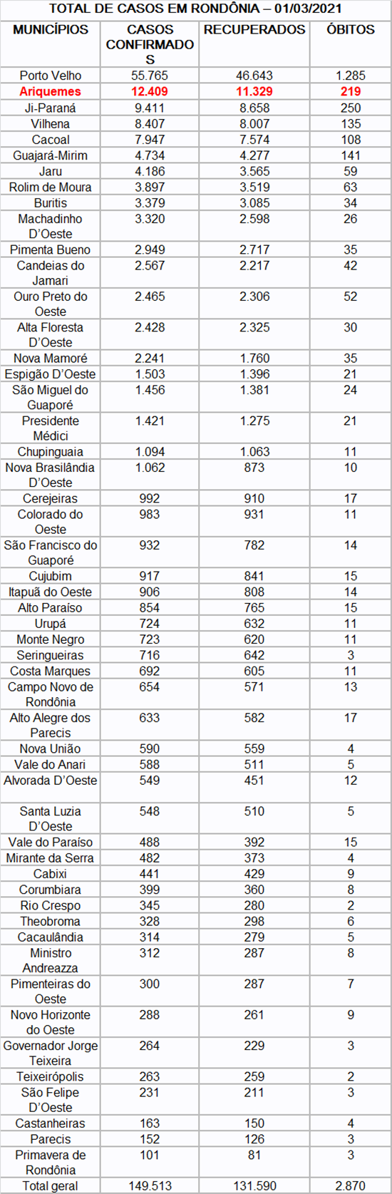 Dos 149.513 casos de covid-19 confirmados em Rondônia, 55.765 são em Porto Velho