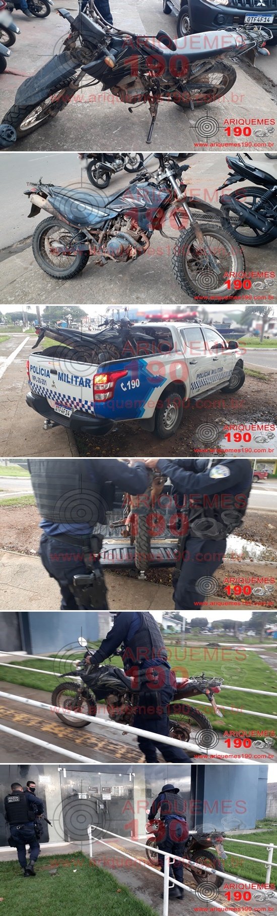 Eram por volta das 18h20m desta quarta-feira, 03/03, quando a Central do 7° Batalhão da Polícia Militar (BPM) foi acionada, para comparecer em um estabelecimento comercial situado na Av. Candeias do Bairro BHN em Ariquemes/RO, pois um indivíduo havia deixado uma motocicleta Yamaha/XYZ de cor preta sem placa no estabelecimento, para realizar um orçamento e não retornou mais. De posse dessas informações, uma guarnição da Polícia Militar, composta pelos policiais: 3º Sgt. Salton, SD Devanilson e SD Benites, se deslocou até o local, onde ao chegar, realizou consulta veicular a motocicleta, a qual possuía restrição de Roubo/Furto. Mediante aos fatos e constatações, a motocicleta foi apreendida para o pátio da Unidade de Segurança Pública (UNISP), onde o Boletim de Ocorrência Policial (BOP) foi registrado, para tomadas de providências posteriores.