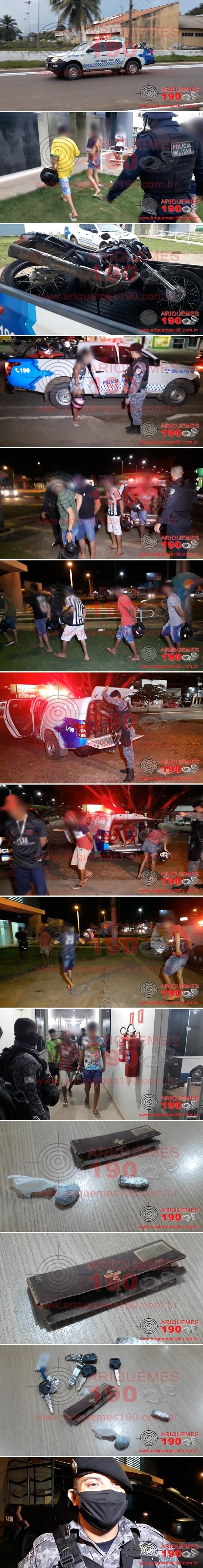 Na tarde deste sábado, 06/03, por volta das 17h30m, a Central do 7° Batalhão da Polícia Militar (BPM) foi acionada, para comparecer na RO-257, em uma estrada que dá acesso a uma instituição, perímetro em que compreende a cidade de Ariquemes/RO, para averiguar uma possível aglomeração de pessoas praticando rachas e manobras perigosas em via pública. De posse dessas informações, guarnições da Polícia Militar se deslocaram até o local, onde ao chegarem, constataram a veracidade dos fatos, encontrando uma grande aglomeração de jovens e motocicletas, os quais praticavam rachas e manobras perigosas. Além dos 16 jovens, estava no local uma criança de 1 ano e dois meses. Durante revista pessoal aos indivíduos, foi localizado no bolso de um dos jovens, um invólucro de substância entorpecente, que aparentava ser Maconha, e também foi encontrado ao solo, outro invólucro da mesma substância entorpecente, que estava próximo de uma jovem. Todos os condutores das motos afirmaram que corriqueiramente utilizam o local para praticarem demonstração de manobras perigosas, e os outros indivíduos relataram que estavam apenas assistindo. Mediante aos fatos e constatações, os condutores das motocicletas foram autuados e conduzidos à Unidade de Segurança Pública (UNISP), pela prática do crime de Aglomeração e Direção Perigosa, e os outros que estavam assistindo foram conduzidos pelo crime de causar Aglomeração. O Boletim de Ocorrência Policial (BOP) foi registrado, para tomadas de providências cabíveis.