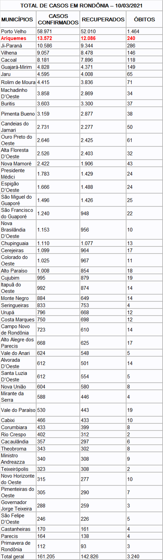 Nesta quarta-feira (10) foram consolidados os seguintes resultados para Covid-19 em Rondônia: