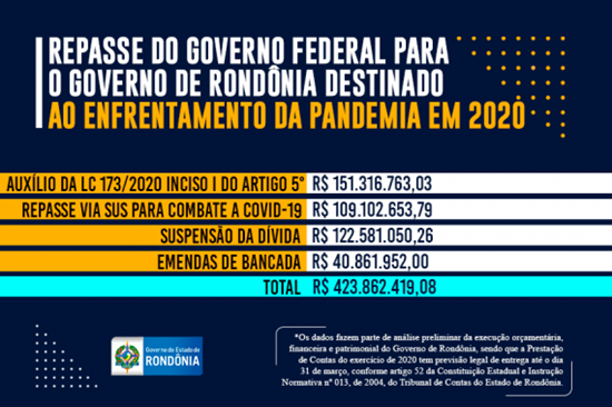 Desta forma, o Governo de Rondônia recebeu da União R$ 423.862.419,08 milhões exclusivamente para enfrentamento à pandemia.