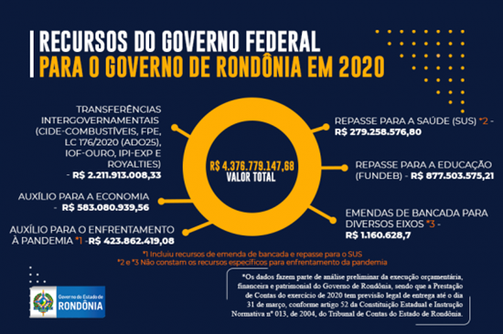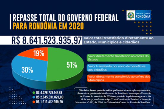 A Secretaria do Tesouro Nacional aponta por meio do Painel das Transferências Intergovernamentais que dos R$ 8,6 bilhões repassados do Governo Federal para Rondônia no ano passado, R$ 4.376.779.147,68 (quatro bilhões, trezentos e setenta e seis milhões, setecentos e setenta e nove mil, cento e quarenta e sete reais e sessenta e oito centavos) foram destinados ao Governo do Estado, enquanto o restante do recurso foi diretamente repassado às prefeituras (R$ 1.619.412.959,29 bilhão) e aos cidadãos (R$ 2.645.331.829,00 bilhões) por meio do pagamento do auxílio emergencial.