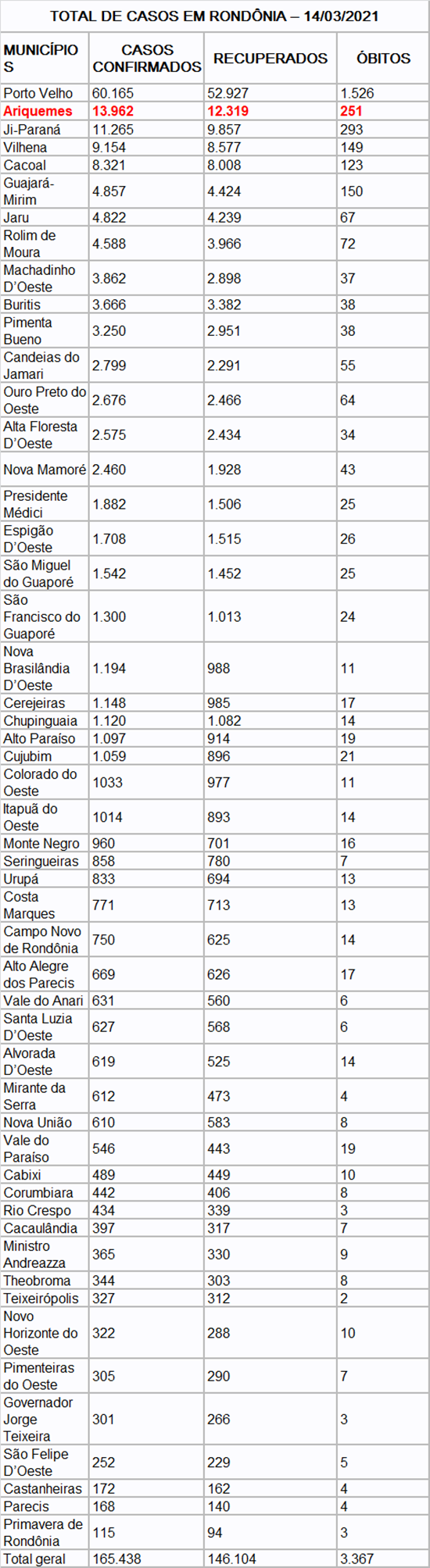 Hoje (14) foram registrados 21 óbitos por Covid-19 em Rondônia, 14 em Porto Velho, sendo seis homens (61, 67, 85, 90, 90 e 56 anos) e oito mulheres (84, 39, 82, 36, 79, 81, 52 e 83 anos); dois em Ariquemes, sendo um homem de 74 anos e uma mulher de 77; dois em Espigão do Oeste, sendo um homem de 68 anos e uma mulher de 85 anos de idade; dois homens de Ji-Paraná (60 e 87 anos) e um homem de 65 anos do município de Monte Negro.