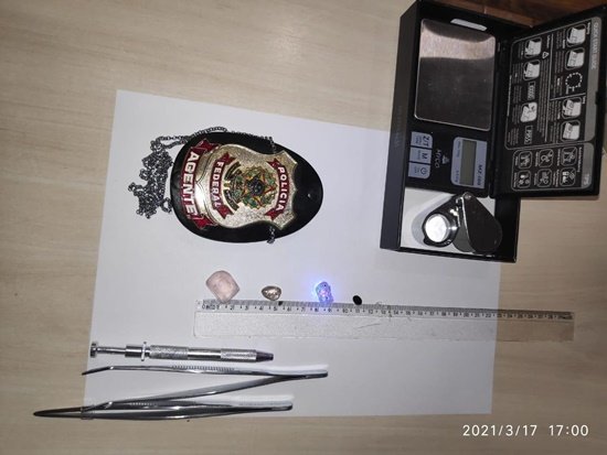 Também foi encontrado uma pedra sem identificação e apetrechos próprios para atividades com pedras preciosas, entre eles uma balança de precisão, lupa, pinças e caneta com luz ultra violeta, sendo que um veículo Fiat Toro foi apreendido em conjunto.