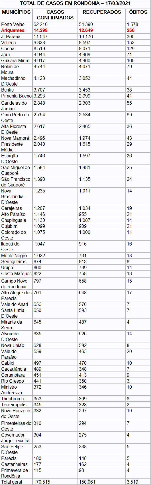 Nesta quarta-feira (17) foram consolidados os seguintes resultados para Covid-19 em Rondônia: