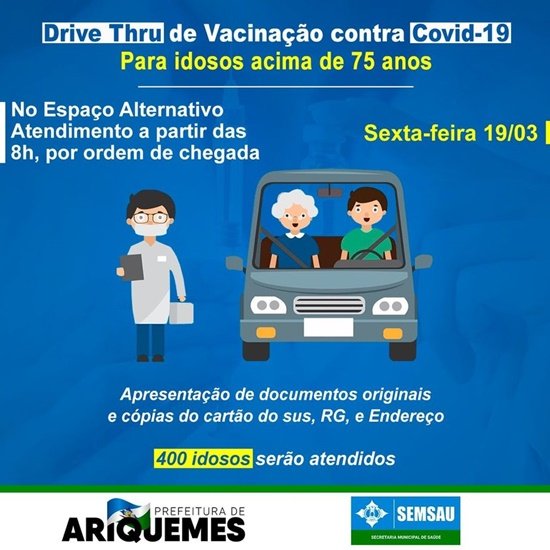 A Secretaria Municipal de Saúde informa que, com a chegada de novas doses da vacina contra à COVID-19, acontecerá um novo atendimento para os idosos na faixa etária acima de 75 anos. O atendimento será realizado na modalidade Drive Thru, nesta sexta-feira (19), a partir das 8h, no Espaço Alternativo, e será por ordem de chegada. A Secretaria informa ainda que, deverá ser atendido um quantitativo de 400 idosos. Para receber o atendimento, o idoso deverá ter acima de 75 anos, ser residente do município de Ariquemes e levar o cartão do SUS, RG, e comprovante de endereço, cópias e originais.