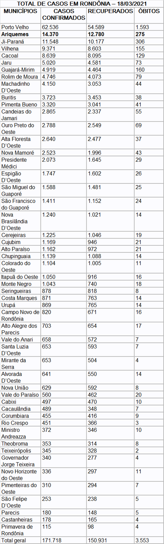 Nesta quinta-feira (18) foram consolidados os seguintes resultados para Covid-19 em Rondônia: