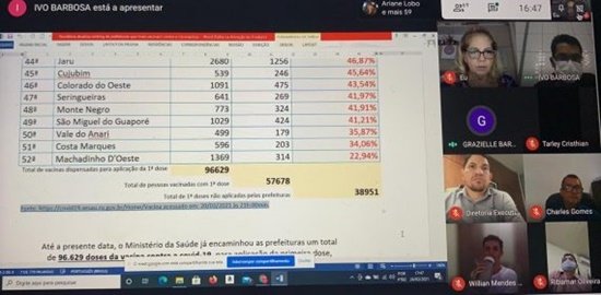 O Governo de Rondônia, por meio da Agência Estadual de Vigilância em Saúde (Agevisa), se reuniu por videoconferência, nessa quarta-feira (24), com representantes do Ministério da Saúde (MS), Associação de Municípios de Rondônia (Arom), prefeitos e secretários de Saúde dos 52 municípios rondonienses para tratar da vacinação de combate à Covid-19, em Rondônia.