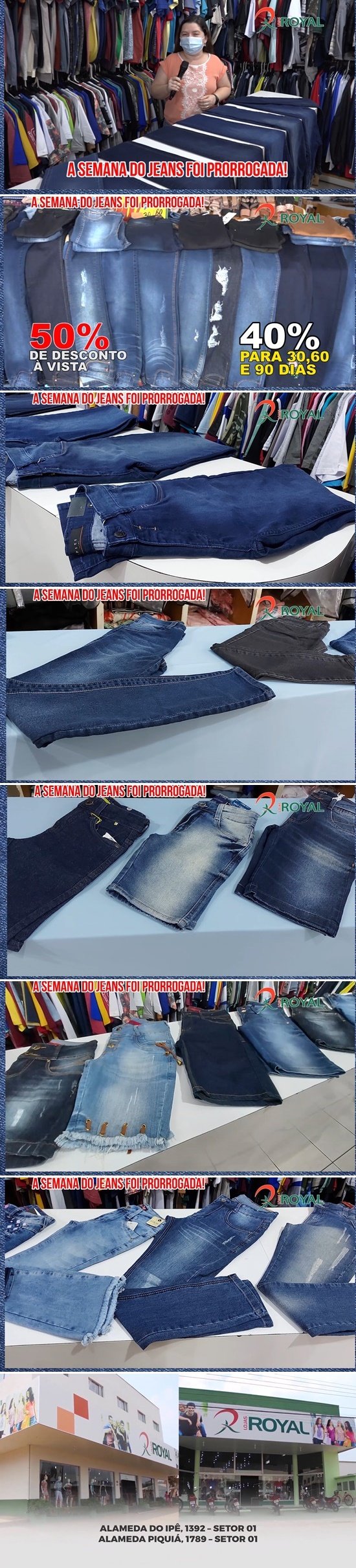 É isso mesmo! A Semana do Jeans da Lojas Royal foi prorrogada! Uma seção especial espera por você, com desconto de 50% à vista e 40% para pagar em 30, 60 e 90 dias. São Bermudas feminina e masculina infantil, calça feminina e masculina infantil, bermuda feminina adulto, calça feminina e masculina adulto, e muito mais. Corra para a Lojas Royal, localizadas na Alameda Piquiá, 1789, e Alameda do Ipê, 1392, - Centro. UMA SEMPRE PERTO DE VOCÊ!