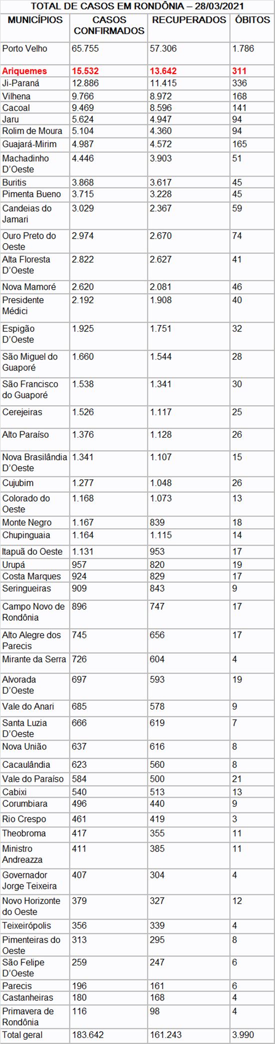 Para informações detalhadas e relatórios na íntegra, acesse o Portal Coronavírus em Rondônia, através do endereço: coronavirus.ro.gov.br