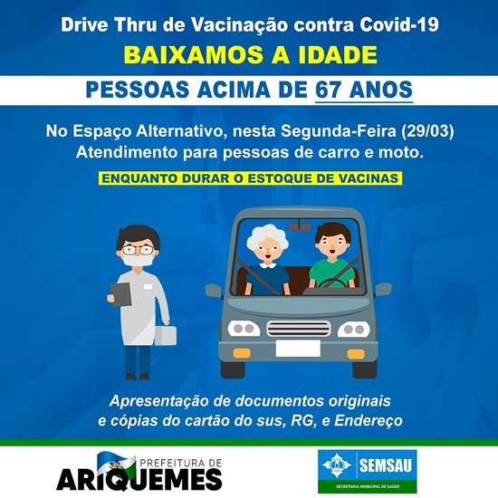 Idosos acima de 67 anos poderão se deslocar nessa segunda-feira (29/03) ao Espaço Alternativo de carro ou moto e receber a vacina contra à COVID-19.