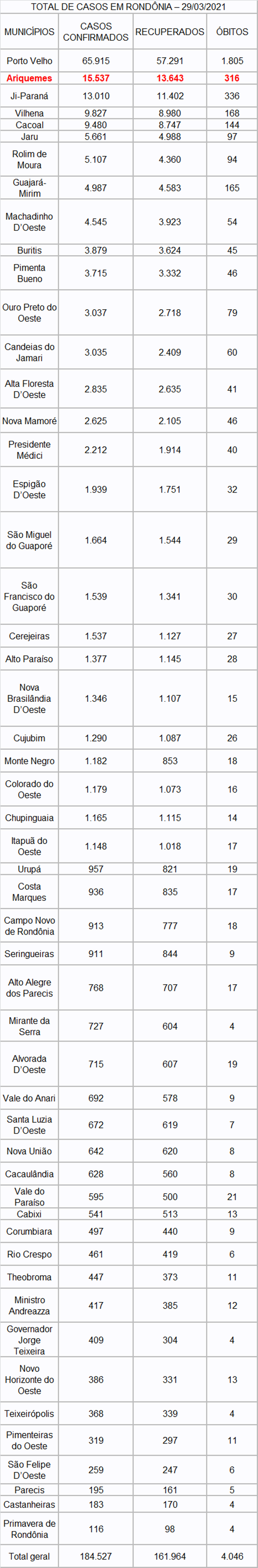 Nesta segunda-feira (29) foram registrados 56 óbitos por Covid-19 em Rondônia, 19 foram em Porto Velho, sendo 10 mulheres (84, 83, 78, 77, 75, 66, 53, 48, 46 e 36 anos), oito homens (97, 84, 67, 65, 59, 58, 55, 42) e uma criança do sexo masculino de cinco anos de idade; cinco em Ariquemes, sendo todos do sexo masculino (71, 70, 63, 58 e 35 anos); cinco em Ouro Preto do Oeste, sendo duas mulheres (71 e 72 anos) e três homens (58,71 e 72 anos); três em Machadinho d’Oeste, sendo uma mulher de 55 anos e dois homens (59 e 53 anos); três homens em Jaru (82, 62, 50 anos); três em Cacoal, sendo uma mulher de 70 anos, um homem de 68 anos e uma criança do sexo masculino de três anos de idade; três em Rio Crespo, sendo uma mulher de 44 anos e dois homens (59 e 51 anos), três em Pimenteiras do Oeste, sendo duas mulheres (74 e 56 anos) e um homem de 68 anos de idade; dois em Alto Paraíso, sendo uma mulher de 72 anos e um homem de 64 anos de idade; dois homens em Colorado do Oeste (89, 94 e 75 anos); dois homens em Cerejeiras (57 e 24 anos); um homem de 51 anos em Pimenta Bueno; um homem de 52 anos em Campo Novo de Rondônia; uma mulher 68 anos em Novo Horizonte do Oeste; um homem de 79 anos em São Miguel do Guaporé; um homem de 66 anos de idade em Ministro Andreazza; e um.