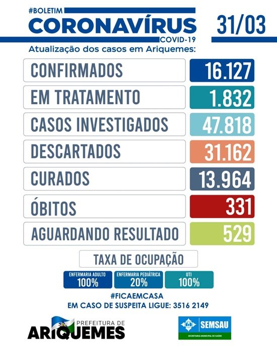 Nesta Quarta-feira (31), a cidade registra 13.964 pessoas curadas, 74 a mais que a do dia anterior. Foram confirmados 109 novos casos, totalizando 16.127.