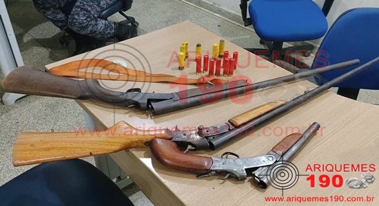 Eram por volta das 22h01m desta terça-feira, 30/03, quando a guarnição da Polícia Militar (BPM) denominada Patrulha Rural realizava patrulhamento pelo desvio do Travessão B-40 Sul, perímetro em que compreende a cidade de Ariquemes/RO, e abordou um veículo Fiat/Uno, que dois indivíduos trafegavam. Ao realizar revista pessoal aos indivíduos nada de ilícito foi encontrado, porém foram localizadas no interior do veículo três armas de fogo, sendo uma Espingarda Calibre .28 de fabricação artesanal, uma Garrucha Calibre .28 de fabricação artesanal e 8 cartuchos Calibre .28, que o condutor confessou ser de sua propriedade. Também foram encontradas uma Espingarda Boito Calibre .20 e 6 cartuchos Calibre .20, que o passageiro assumiu ser de sua propriedade. Mediante aos fatos e constatações, os dois indivíduos foram conduzidos, juntamente com o armamento, à Unidade de Segurança Pública (UNISP), onde o Boletim de Ocorrência Policial (BOP) foi registrado, para tomadas de providências cabíveis.