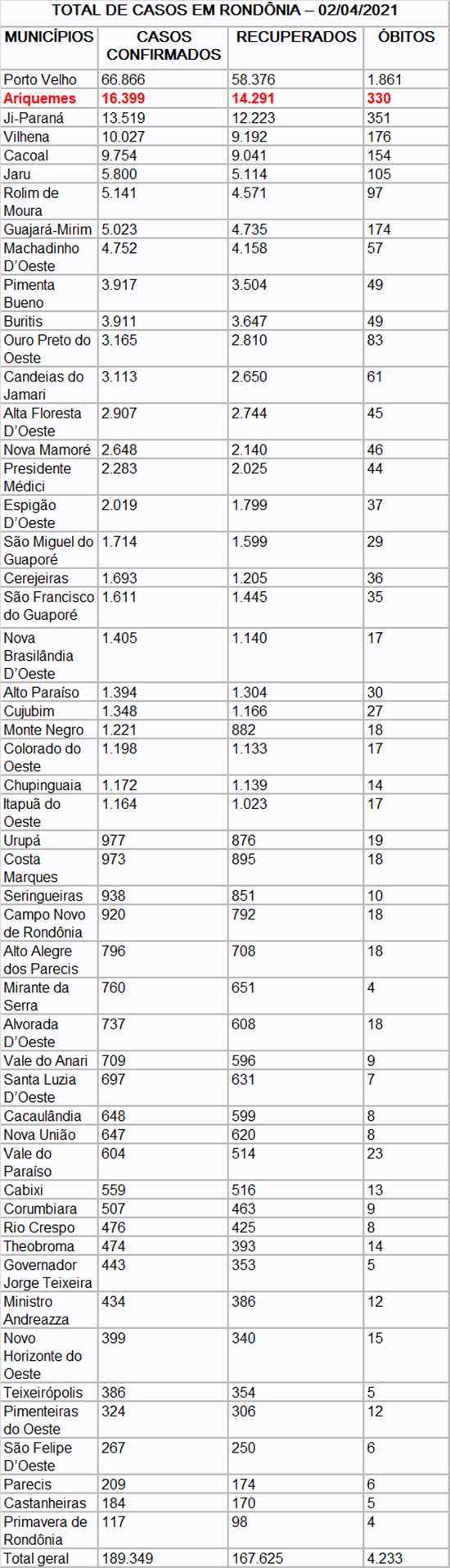 COVID-19: JÁ SÃO 167.625 CURADOS - Edição 378 – Boletim diário sobre coronavírus em Rondônia