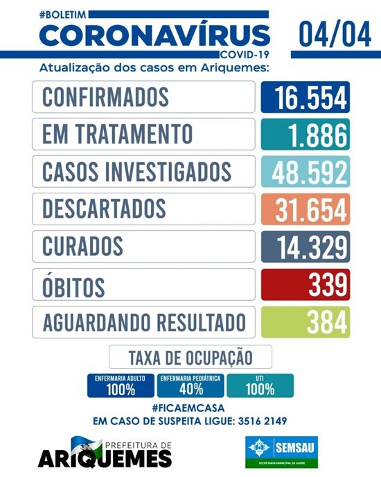 Neste Domingo (04), a cidade registra 14.329 pessoas curadas, 24 a mais que a do dia anterior. Foram confirmados 39 novos casos, totalizando 16.554.