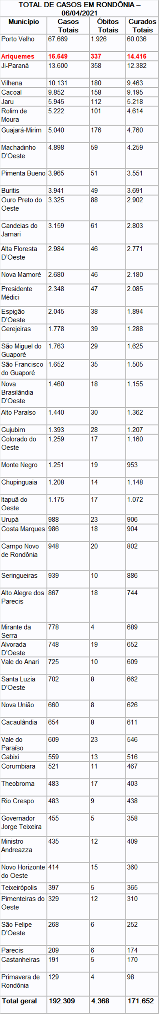 Nesta terça-feira (6) foram registrados 41 óbitos por Covid-19 em Rondônia, no qual 13 foram em Porto Velho, sendo seis mulheres (77, 66, 66, 58, 53 e 45 anos) e sete homens (87, 69, 69, 63, 60, 53 e 45 anos de idade); quatro em Jaru, sendo duas mulheres (75 e 68 anos) e dois homens (58 e 53 anos); quatro de Rolim de Moura, sendo duas mulheres (73 e 62 anos) e dois homens (72 e 70 anos); três homens (74, 73 e 27 anos) em Ji-Paraná; três de Ouro Preto do Oeste, sendo duas mulheres (64 e 55 anos) e um homem de 70 anos; uma mulher de 66 anos e dois homens (73 e 63 anos de idade) de Urupá; uma mulher de 79 e um homem de 71 anos de Campo Novo de Rondônia; uma mulher de 56 e um homem de 63 anos de Cerejeiras; um homem de 66 anos de Alta Floresta D’Oeste; um homem de 53 anos de Alvorada D’Oeste; um homem de 68 anos de Cujubim; um homem de 60 anos de Nova Brasilândia D’Oeste, uma mulher de 70 anos de Rio Crespo, uma mulher de 83 anos de Vale do Anari e uma mulher de 37 anos em Vilhena.