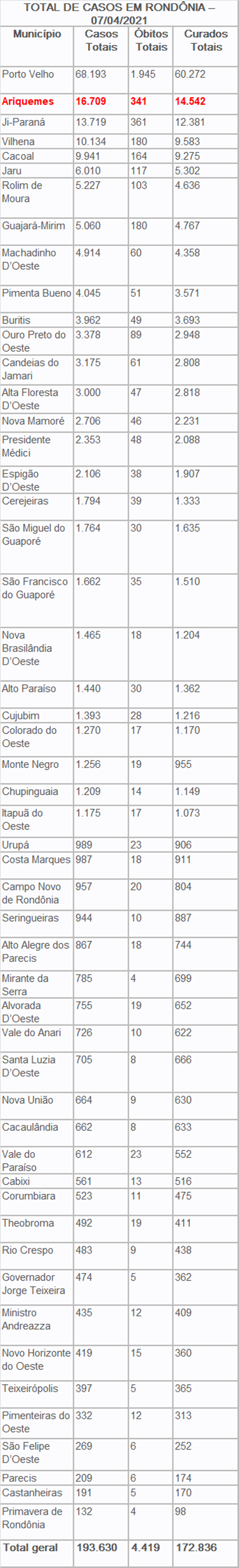 Nesta quarta-feira (7) foram registrados 51 óbitos por Covid-19 em Rondônia, no qual 19 foram em Porto Velho, sendo nove mulheres (83, 78, 73, 72, 70, 69, 67, 61 e 41 anos) e 10 homens (80, 72, 70, 59, 56, 52, 52, 47, 41 e 35 anos); seis em Cacoal, sendo duas mulheres (68 e 55 anos) e quatro homens (88, 87, 72 e 63 anos); cinco de Jaru, sendo três mulheres (78, 75 e 35 anos) e dois homens (73 e 71 anos); quatro em Ariquemes, sendo três mulheres (72, 47 e 32 anos) e um homem de 87 anos; quatro homens (72, 70, 68 e 59 anos de idade) de Guajará-Mirim; três em Ji-Paraná, sendo uma mulher de 46 anos e dois homens (71 e 52 anos); dois de Rolim de Moura, sendo uma mulher de 63 e um homem de 60 anos; dois de Theobroma, sendo uma mulher de 70 e um homem de 65 anos; um homem de 72 anos do município de Alta Floresta D’Oeste; um homem de 34 anos em Machadinho D’Oeste; um homem de 51 anos de Nova União; um homem de 76 anos em Ouro Preto do Oeste, uma mulher de 63 anos de Presidente Médice e uma mulher de 47 anos de São Miguel do Guaporé.