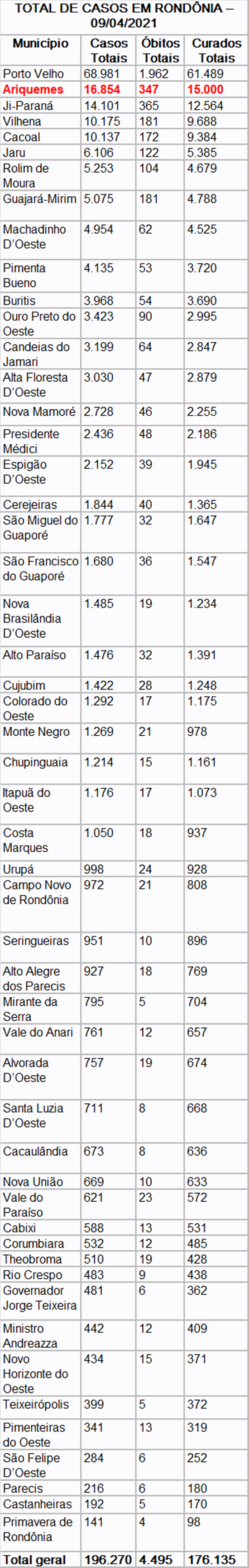 Nesta sexta-feira (9) foram registrados 31 óbitos por Covid-19 em Rondônia, no qual seis foram em Cacoal, sendo três mulheres (81, 67 e 66 anos) e três homens (88, 63 e 57 anos); quatro mulheres (59, 44, 42 e 32 anos) de Ariquemes; quatro em Porto Velho, sendo duas mulheres (76 e 36 anos) e dois homens (68 e 57 anos); uma mulher de 52 anos e um homem de 48 anos em Jaru; uma mulher de 55 anos e um homem de 63 anos de idade em Ji-Paraná; duas mulheres (74 e 67 anos) em Vale do Anari; uma mulher de 62 anos em Candeias do Jamari; um homem de 71 anos de Cerejeiras; uma mulher de 78 anos de Espigão D’Oeste; uma mulher de 43 anos de idade em Governador Jorge Teixeira; um homem de 40 anos em Machadinho D’Oeste; um homem de 68 anos de idade em Nova Brasilândia D’Oeste; uma mulher de 49 anos em Nova União; um homem de 65 anos em Pimenta Bueno; um homem de 49 anos em São Francisco do Guaporé; um homem de 85 anos de São Miguel do Guaporé e um homem de 54 anos em Vilhena.