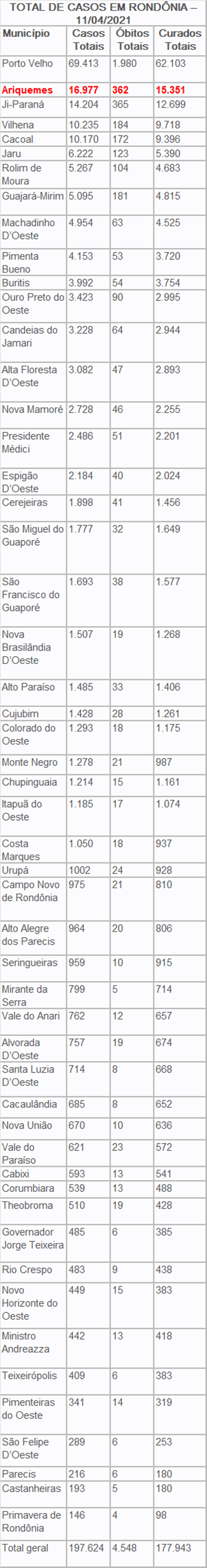 Neste domingo (11) foram registrados 23 óbitos por covid-19 em Rondônia, sete foram em Porto Velho, sendo quatro mulheres (64, 55, 41 e 36 anos) e três homens (60, 57 e 51 anos); seis em Ariquemes, sendo duas mulheres (67 e 63 anos) e quatro homens (74, 71, 66 e 48 anos); três homens de Vilhena (82, 74 e 49 anos de idade; dois em São Francisco do Guaporé, sendo uma mulher de 48 anos e um homem de 56 anos de idade; uma mulher de 55 anos de Alto Alegre dos Parecis; um homem de 53 anos de Alto Paraíso; um homem de 63 anos de Cerejeiras; uma mulher de 42 anos de Colorado do Oeste e um homem de 80 anos do município de Jaru.