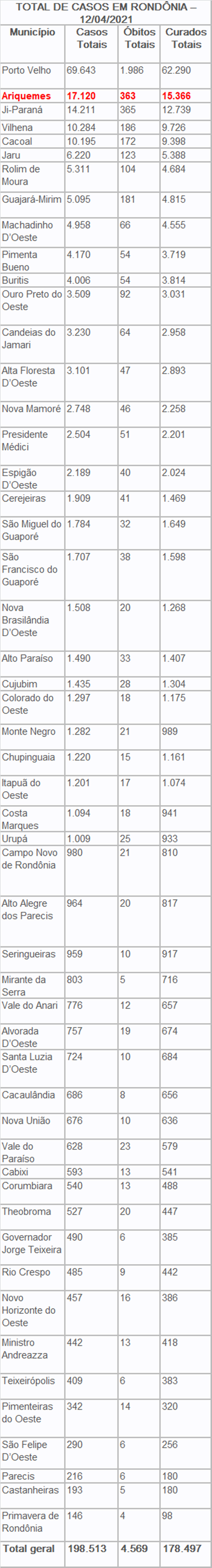 Nesta segunda (12) foram registrados 23 óbitos por covid-19 em Rondônia, desses, sete foram em Porto Velho, sendo três mulheres (76, 70 e 60 anos) e quatro homens (72, 64, 50 e 42 anos); três de Machadinho D’Oeste, sendo duas mulheres (71 e 53 anos) e um homem de 64 anos de idade; dois homens (68 e 58 anos) de Ouro Preto do Oeste; duas mulheres (74 e 35 anos) de Santa Luzia D’Oeste; dois homens (81 e 59 anos) de Vilhena; um homem de 50 anos de Ariquemes; um homem de 73 anos em Jaru; uma mulher de 49 anos de Nova Brasilândia D’Oeste; uma mulher de 59 anos de Novo Horizonte do Oeste; uma mulher de 57 anos de Pimenta Bueno, uma mulher de 53 anos de Theobroma e um homem de 72 anos em Urupá.