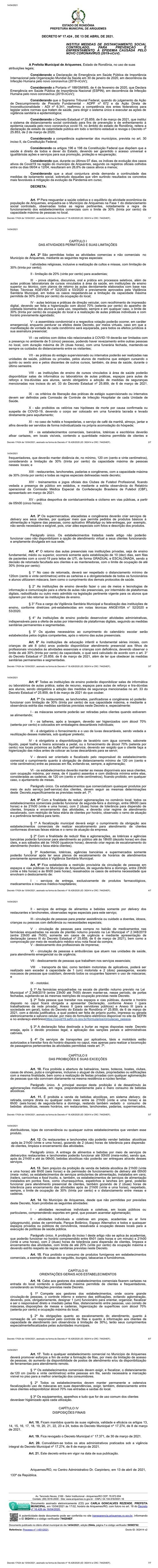 A Prefeita de Ariquemes, Carla Redano, publicou nesta sexta-feira, 26/02, as 14h40m, o novo Decreto Municipal n° 17.255, que já entrou em vigor, visando restringir ainda mais as medidas de Distanciamento Social para o enfrentamento e combate ao coronavírus no município. A Prefeita criou a Comissão de Fiscalização, Controle e Combate ao COVID-19, que aplica multas a quem infringir o Decreto. Confira o Decreto na íntegra: