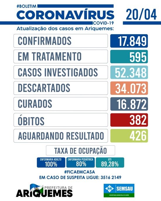 Nesta Terça-feira (20), a cidade registra 16.872 pessoas curadas, 158 a mais que a do dia anterior. Foram confirmados 95 novos casos, totalizando 17.849.
