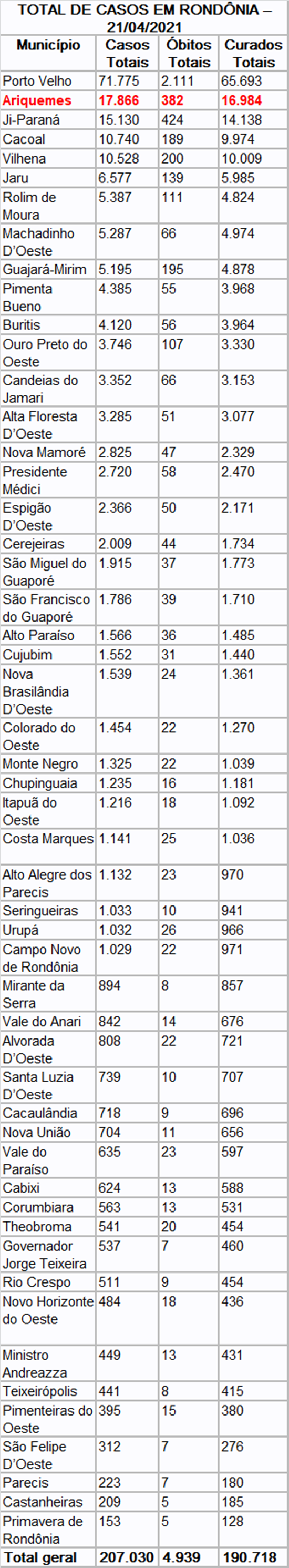 No Estado, os números de casos confirmados, recuperados e de óbitos, desde o primeiro registro em 20 de março de 2020 até hoje (21 de abril de 2021), por covid-19 são: