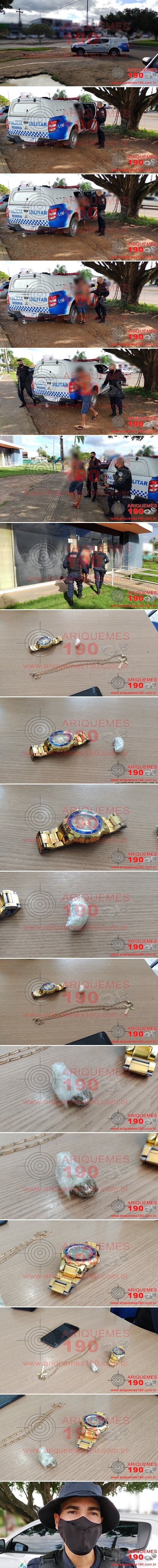 Eram por volta das 15h36m desta segunda-feira, 26/04, quando uma guarnição da Polícia Militar, composta pelos policiais: SD Machado, SD Silvino e SD Soares, realizava patrulhamento pela Rua Ricardo Cantanhede do Setor 11 em Ariquemes/RO, momento em que avistou um grupo de pessoas em uma praça, sendo que ao perceberam a aproximação da viatura, tentaram se evadir do local rapidamente. Diante da suspeição, foi realizado abordagem e revista pessoal a um menor de idade, sendo localizado um aparelho celular, um relógio e no bolso da bermuda que trajava, um invólucro de substância entorpecente análoga à Maconha. Ao ser questionado sobre a origem da droga, o menor confessou aos policiais que era da sua propriedade e que teria ganhado de um indivíduo no Bairro Jardim Feliz Cidade. Mediante aos fatos e constatações, o menor foi conduzido, juntamente com a droga e os objetos, para a Unidade de Segurança Pública (UNISP), onde o Conselho Tutelar acompanhou o registro do Boletim de Ocorrência Policial (BOP), para tomada de providências cabíveis.