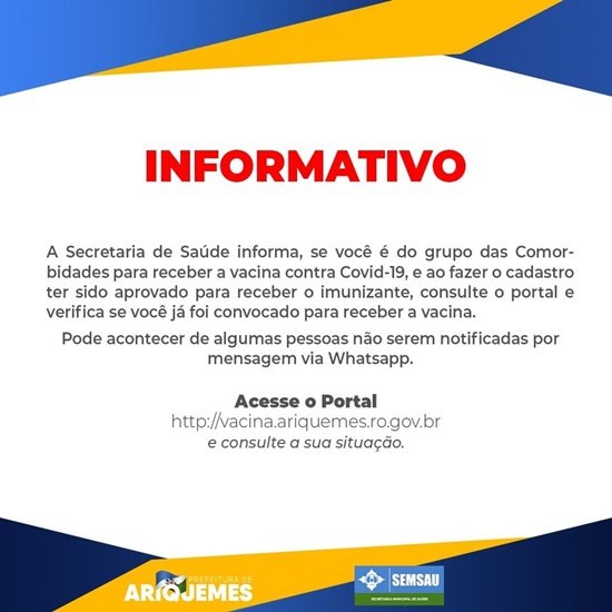 ARIQUEMES: Informativo sobre vacinação contra COVID-19 para o grupo das Comorbidades - Confira