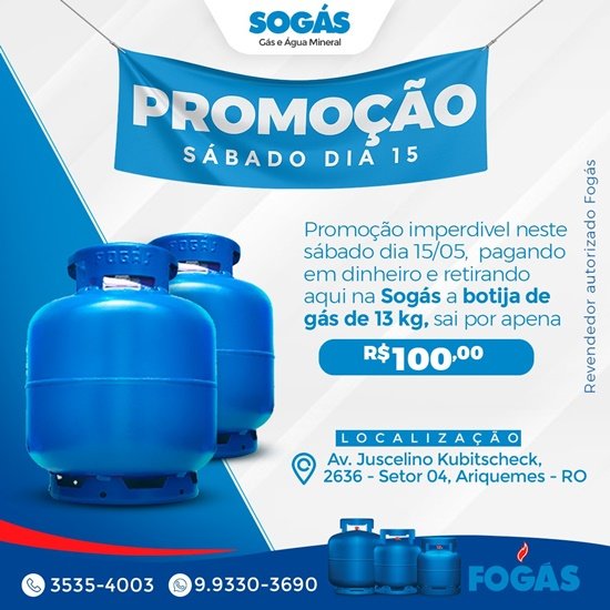 Atenção Ariquemes! Hoje tem promoção na Sogás! Só neste sábado, 15/05, a recarga de gás estará custando R$ 100,00, apenas retirando na portaria e pagando em dinheiro. É isso mesmo! E neste final de ano, a Sogás irá realizar o sorteio de uma Smart TV Led de 42 Polegadas aos clientes. Ainda tem mais! Concorra todo mês uma recarga de gás de 13 KG. A Sogás tem Cartão Fidelidade. Comprando 10 galões de água, você ganha 1. Sogás, revendedor autorizado do gás azul Fogás, localizada na Av. JK n° 2636 Setor 04. Confira o vídeo: