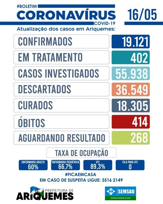 Neste Domingo (16), a cidade registra 18.305 pessoas curadas, 02 a mais que a do dia anterior. Foram confirmados 43 novos casos, totalizando 19.121.
