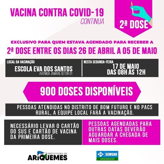 Atenção! Vacina contra Covid-19! 2ª DOSE DA CORONAVAC. Se você estava agendado para receber a 2ª Dose do imunizante, entre os dias 26 de Abril a 05 de Maio, chegou a sua vez. O atendimento acontecerá nesta Segunda-feira, 17, das 08h às 12h, na Escola Eva Dos Santos. É preciso levar o Cartão do SUS, e a carteirinha da 1ª DOSE. Não deixe de receber o reforço, só assim você poderá se proteger, e proteger as pessoas a sua volta.