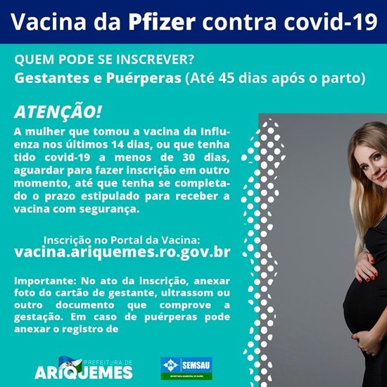 A Secretaria de Saúde de Ariquemes realizou a abertura das inscrições para agendamento da vacinação contra COVID-19 para gestantes e puérperas (até 45 dias após o parto). Ao conceder entrevista à equipe de reportagens do Site Ariquemes190 e Canal 35.1 Digital, a Ândrea Gaspar, Gerente da Vigilância de Saúde e Coordenadora da Campanha de Vacinação, pediu as gestantes e puérperas que possam se inscrever, aquelas que não tomaram a vacina da Pfizer nos últimos 14 dias e que não tiveram COVID em menos de 30 dias. Confira o vídeo: