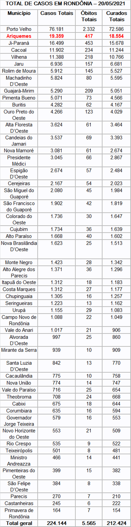 Nesta quinta-feira (20) foram registrados 21 óbitos por covid-19 no Estado, destes, seis foram Porto Velho, sendo quatro mulheres (75, 51, 45 e 35 anos de idade) e dois homens (68 e 64 anos de idade); dois foram de Ariquemes, sendo os dois homens (60 e 42 anos de idade); dois foram em Presidente Médici, sendo os dois homens (73 e 65 anos de idade); um homem de 52 anos de Alto Alegre dos Parecis; uma mulher de 65 anos de Costa Marques; uma mulher de 62 anos de Guajará-Mirim; um homem de 68 anos de Jaru; um homem de 101 anos de Ji-Paraná; um homem de 65 anos de Machadinho D’Oeste; um homem de 79 anos de Monte Negro; uma criança do sexo masculino com menos de um ano de idade em Nova Mamoré; um homem de 66 anos de Ouro Preto do Oeste; um homem de 64 anos de Rolim de Moura e uma mulher de 65 anos de Vilhena.
